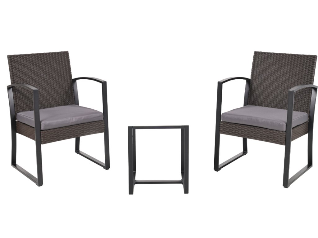 Balcony set, steel frame with plastic mesh, seats with dark gray polyester covers, table with glass top.Chair - 60x52x74 cmTable - 40x40x41 cm