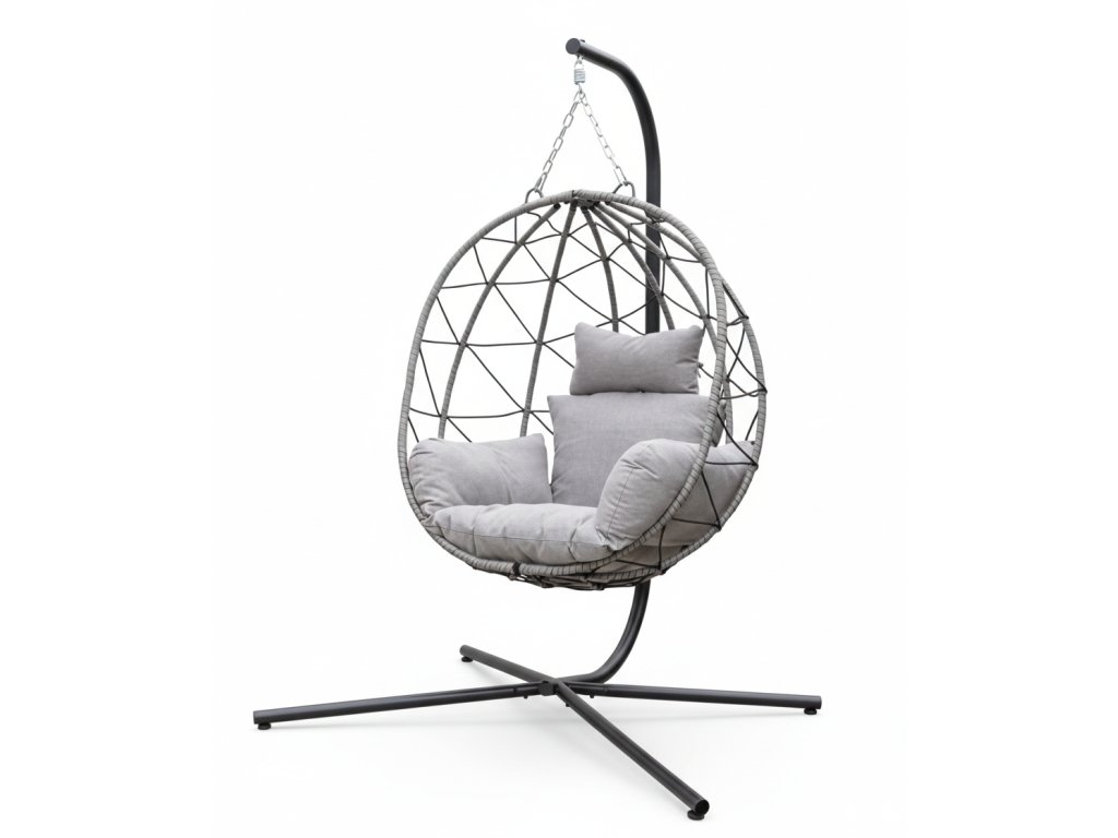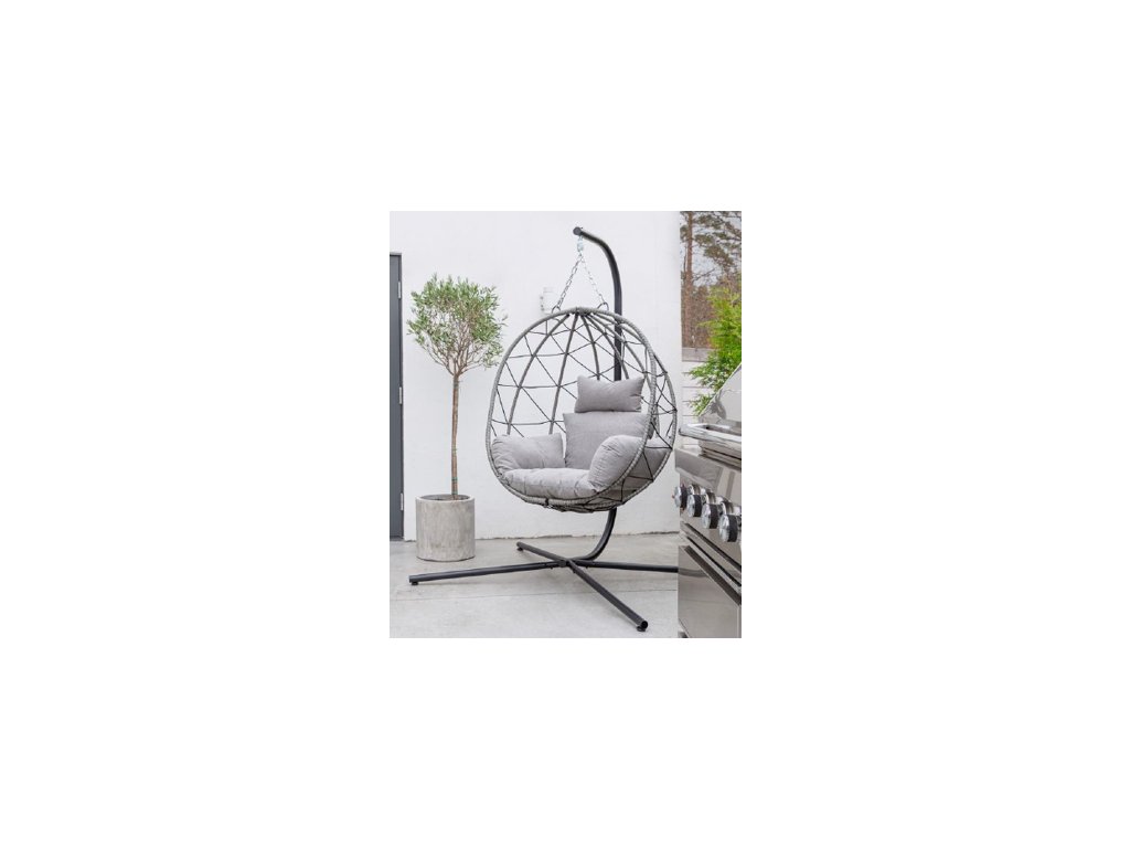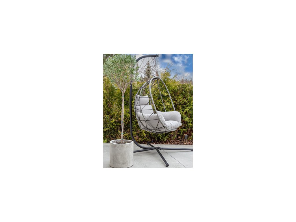 Hanging chair with black steel frame, gray and black polyester cushionsHeight - 185 cmBasket - 110x90x60 cm