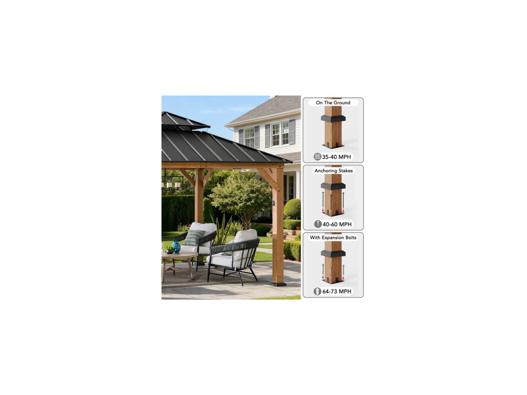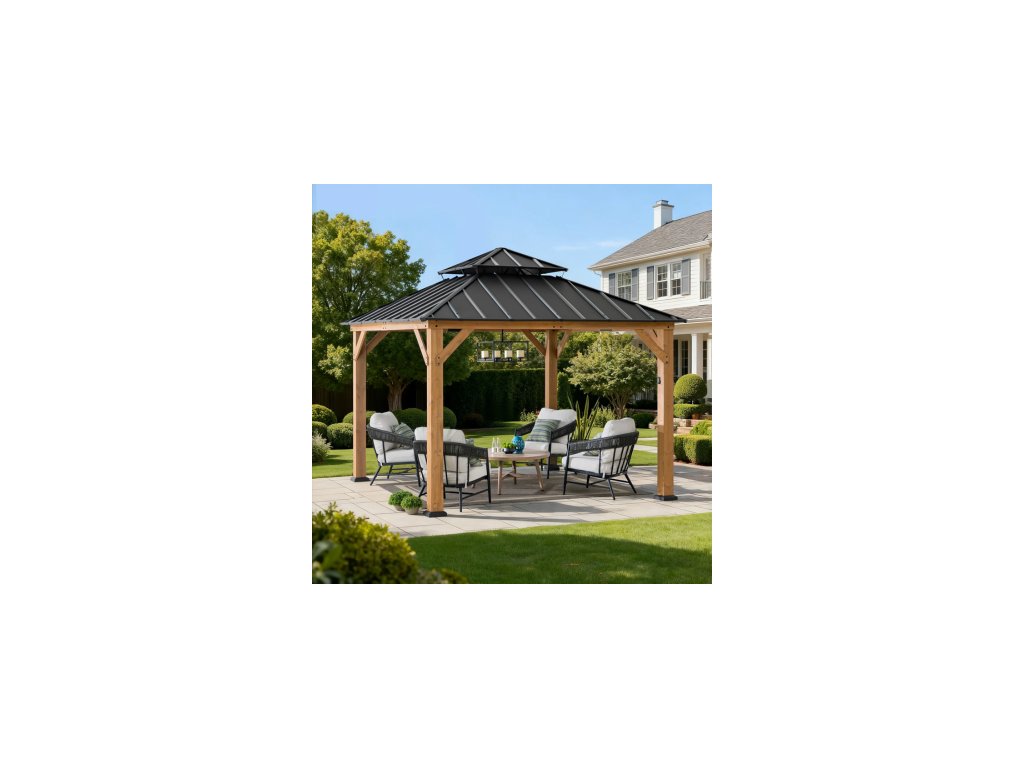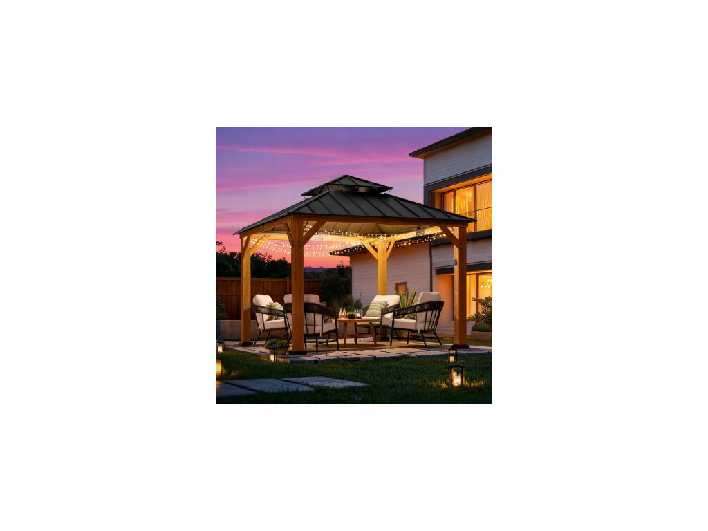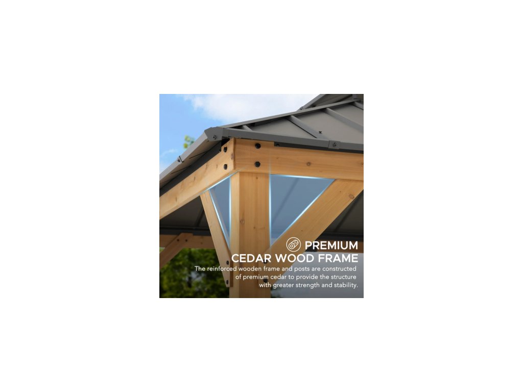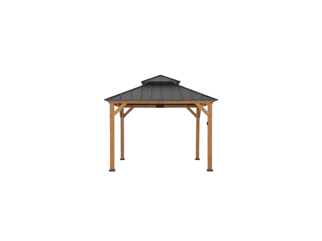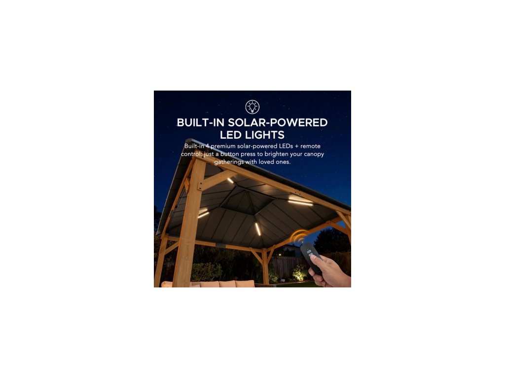 Expand your living space by bringing the indoors outside and creating your end-of-the-day oasis that’s the perfect spot for entertaining family and friends.Spend all four seasons enjoying your covered area outdoors under a cedar wood frame gazebo with a sturdy powder-coated steel roof top that will stand the test of time. The 2-tier roof provides just the right amount of airflow while simultaneously keeping occasional inclement weather at bay.The solar panel on the top can power up the built-in LED lights. Set the mood by suspending a chandelier from the incorporated ceiling hook for additional functional light and high design. With straightforward, easy-to-follow assembly instructions you’ll be relaxing with your beverage of choice in your favorite new outdoor living space for years to come.