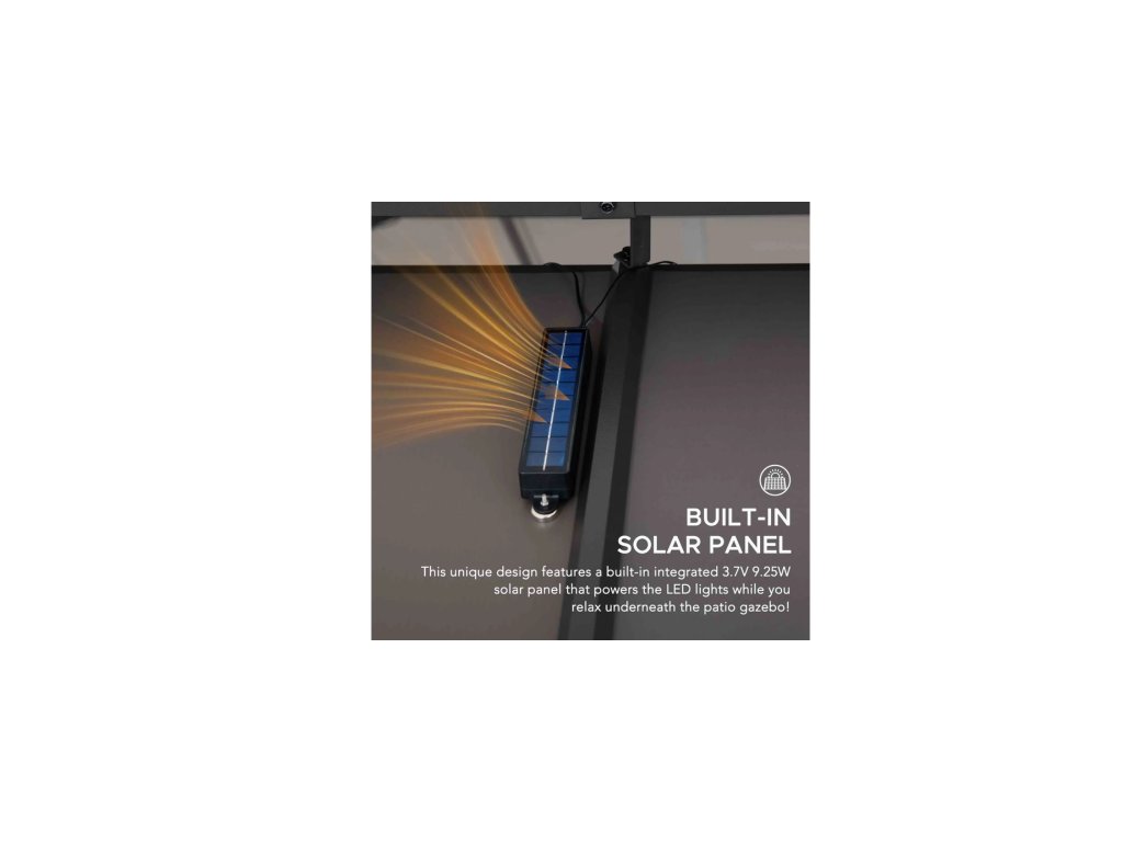 - Built-in Solar Panel: This unique design features a built-in integrated 3.7V 9.25W solar panel that powers the LED lights while you relax underneath the patio gazebo