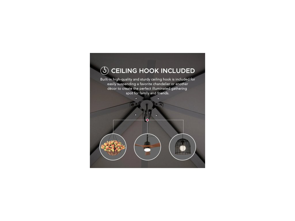 - Decorative Ceiling Hooks for Ambiance & Versatility: Two built-in ceiling hooks support up to 11kg each, allowing you to hang plants, fans, or lights with ease. Customize your space with personal touches that add charm, energy, and creative freedom to your outdoor setting.